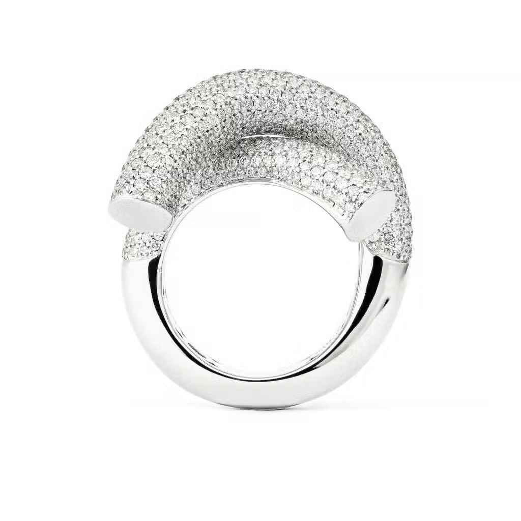 The Cross Loop ring is crafted in 18k yellow, white and rose gold and set with a total of 3.81 carats of rare white (G/VS) brilliant cut diamonds.