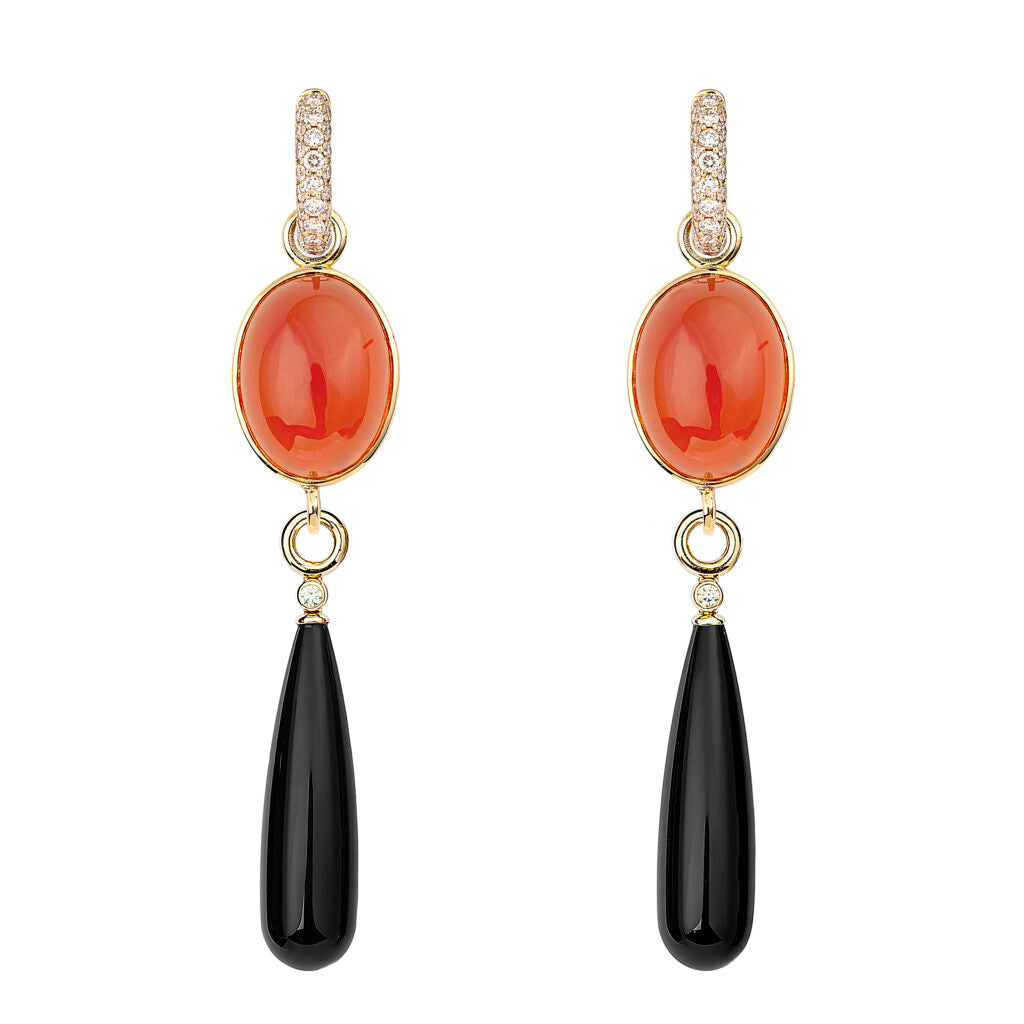Pendientes Swedish Grace en oro amarillo con cornalina roja, ónix negro y diamantes blancos.