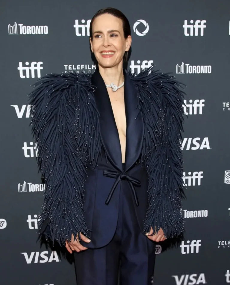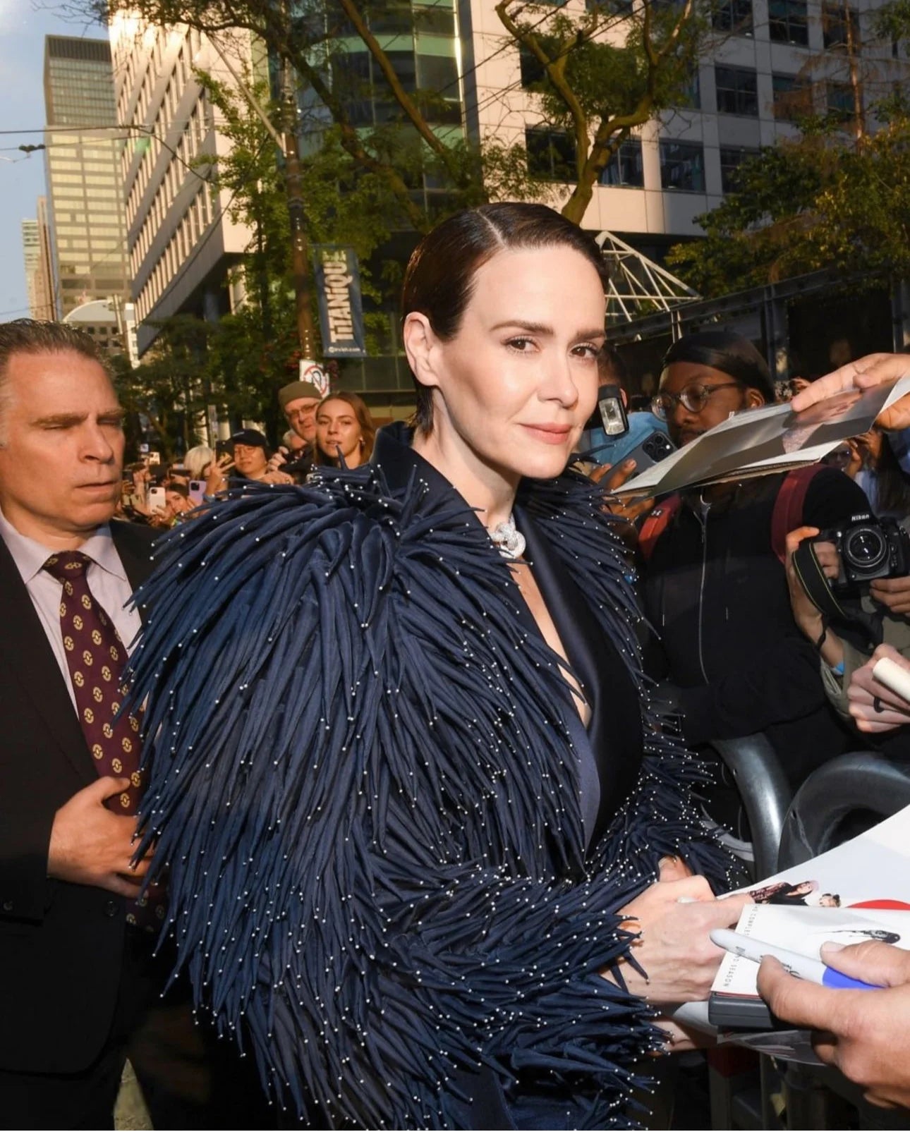 American actress Sarah Paulson attends the “Hold Your Breath” premiere during the 2024 Toronto International Film Festival wearing Engelbert’s exclusive Legacy Knot Necklace and Schiaparelli couture.